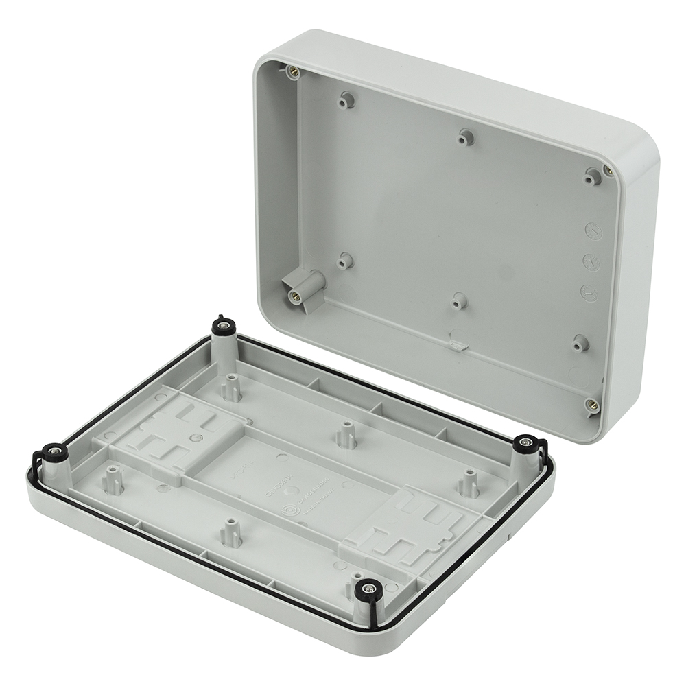 • PCB Mounting. Four (CBNODE-01) or Six (CBNODE-02, 03, 04) PCB mounting pillars inside the lid and base, suitable for 3mm thread forming screws and No. 4 self-tapping screws.