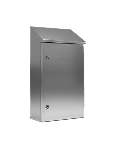 Enclosure with sloped roof, wall-mounting and high resistance to harsh chemical and environmental agents.