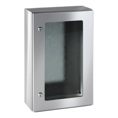 Material: Enclosure and door: pre-satinized AISI304L stainless steel sheet and silicone foam seal. Transparent door: glass plate. Door closing system with box and insert in zinc alloy, tongue and hinges in stainless steel. Mounting plate: sendzimir sheet