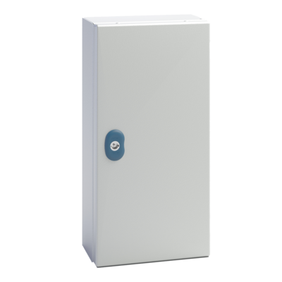 Junction box with single blank door in sheet steel, equipped with 1/4 turn locking system.